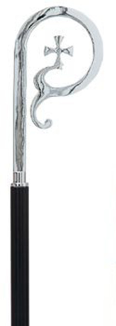 Bishop Crozier. Satin crook, bright staff. 72 inch high overall (3 pieces). Stainless steel. Stones on face and wood insert on shaft available for an additional charge.