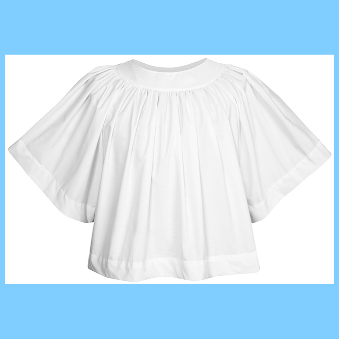 Liturgical knee length, round yoke, permanent press, 65% polyester and 35% cotton surplice.