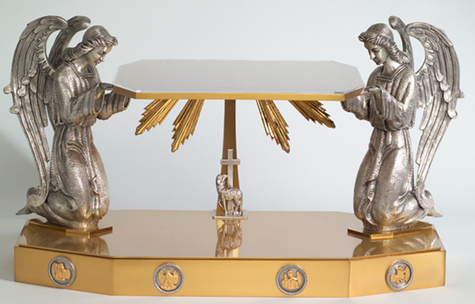 Thabor. 24 karat gold plate with large antique silver plated angels. Overall dimensions: 26 inch wide x 13 inch deep x 14 inch high, weight 39 pounds.