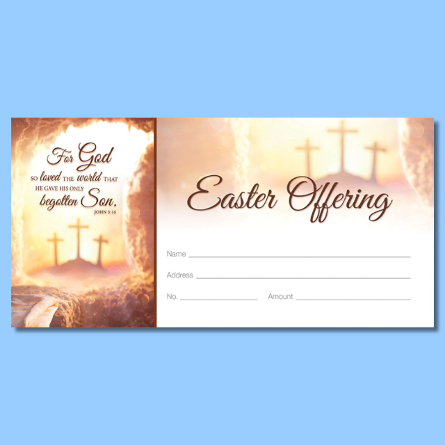 Full-color offering envelope that has space for name, address, envelope number, and amount of donation. Shrink wrapped in packs of 100, 3-1/8" x 6-1/4".