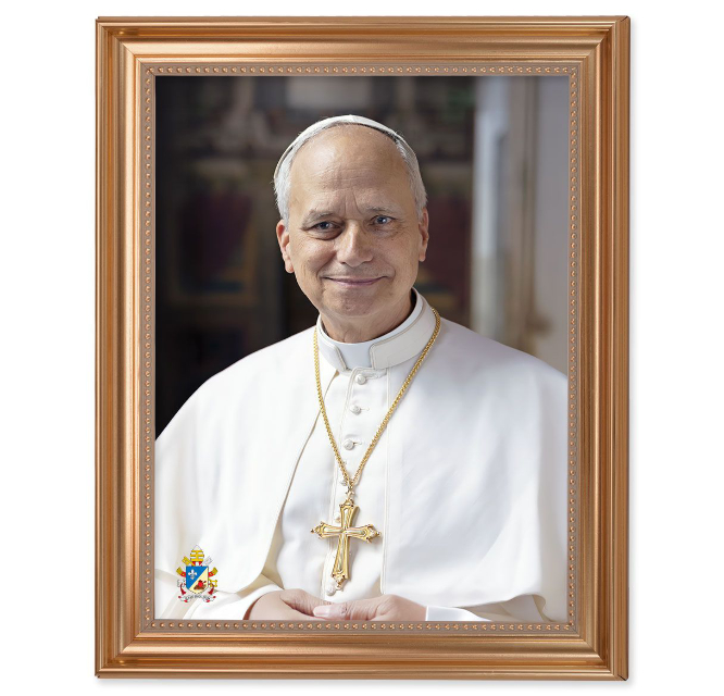 With this formal portrait of Pope Leo XIV, celebrate our new Holy Father with this beautiful framed image. 11 inch x 14 inch textured print in an antique gold frame with bead inlay. Finished size 13-1/2" x 16-1/2".
