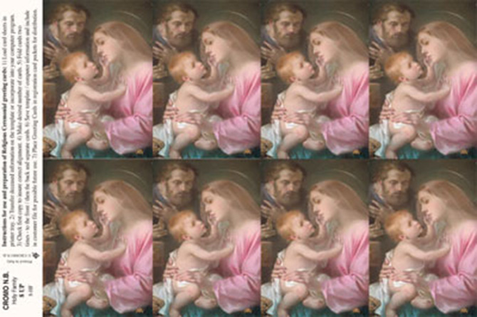 Full color paper holy cards on a sheet with custom imprint of your choice on back.. Micro-perforated to easily detach. Submit by fax or email the message or prayer you want to be printed on the back of the cards. A proof of the exact text will be provided for your approval and signature. 8 cards per sheet. Minimum amount to imprint 3 sheets or 24 holy cards. 8-1/2" x 10", individual card size 2 1/2" x 4 1/4