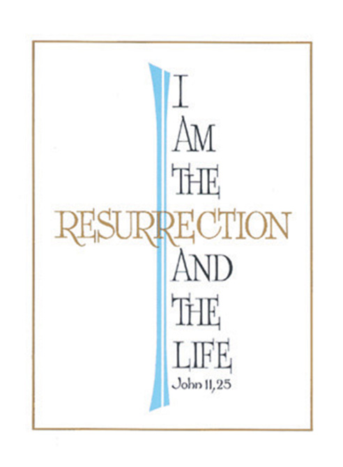 "I am the Resurrection and the Life" text on the front. Inside Verse Reads :: "The Holy Sacrifice of the Mass will be offered for the repose of the soul of ___________________". 100 per box. 4-1/2" x 6-1/8"