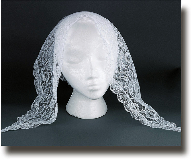 Triangle-like shape mantilla. 39 inch x 39 inch x 29 inch in white color. In satin pouch.