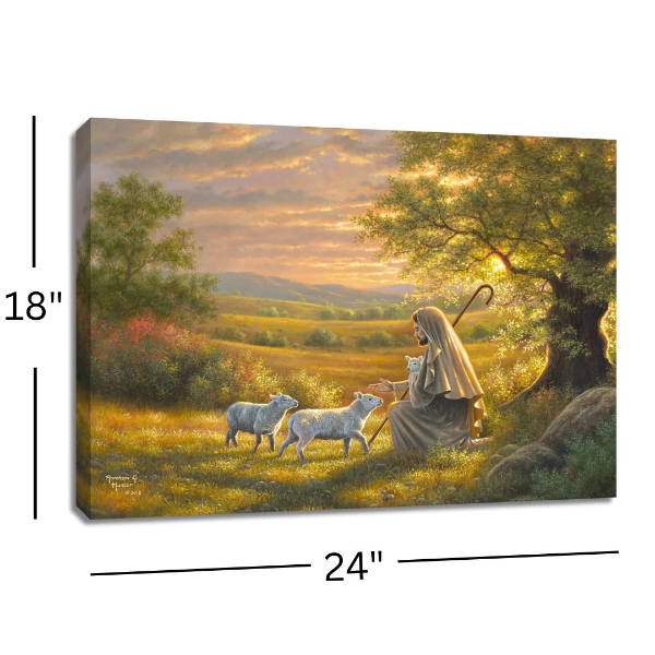 Dona Gelsinger's portrait of the Good Shepherd entitled Come Unto Me. Fully illumiated LED color changing lights- 16 muli-colored lights with remote control and a 2, 4 or 6 hour timer Power by a USB cable which is included or AA battery which is not included.